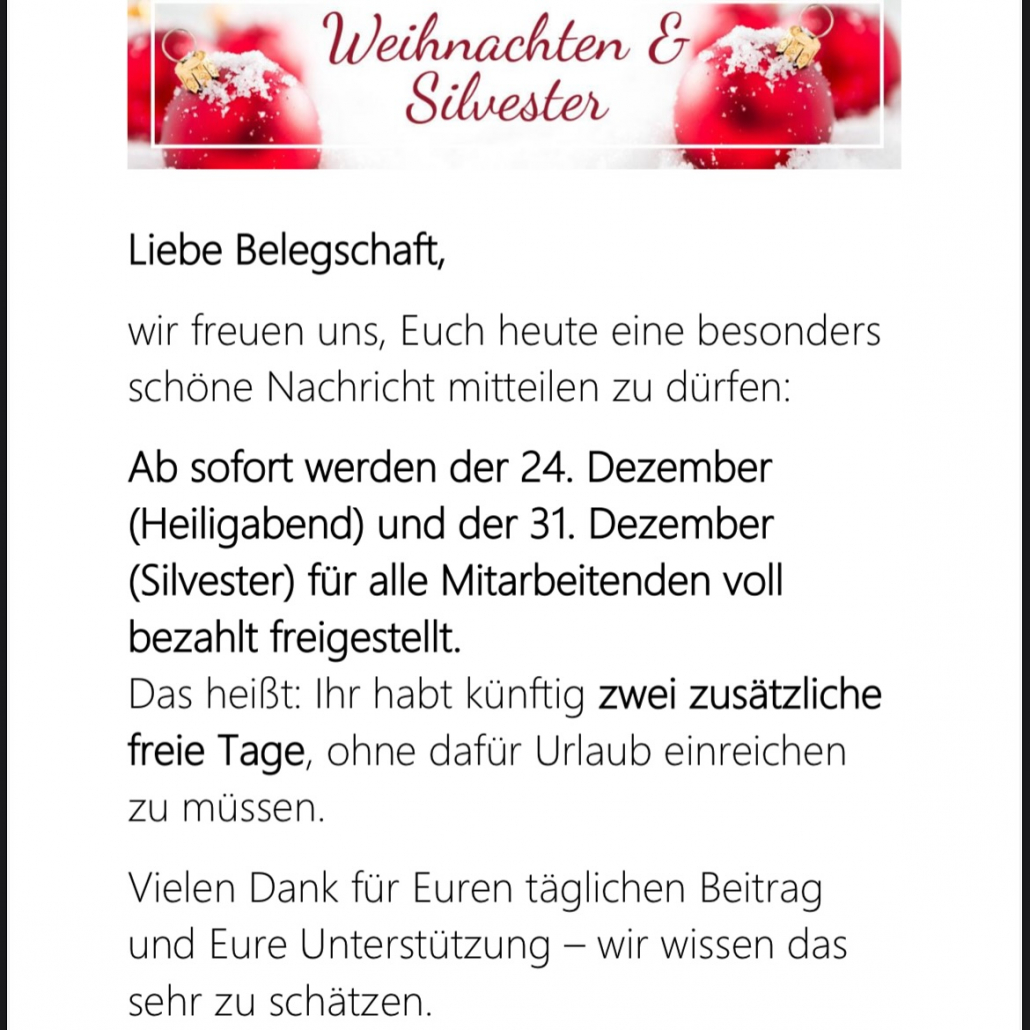 Ab diesem Jahr sind alle Mitarbeiter sowohl am 24.12 als auch am 31.12 für voll bezahlt freigestellt.